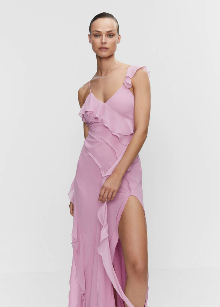 Tissu en gaze. Tissu fluide. Tissu semi-transparent. Asymétrique. Coupe droite. Coupe longue. Col en V. Bretelles fines. Dos nu. Fermeture Éclair latérale. Détails volantés. Fente latérale