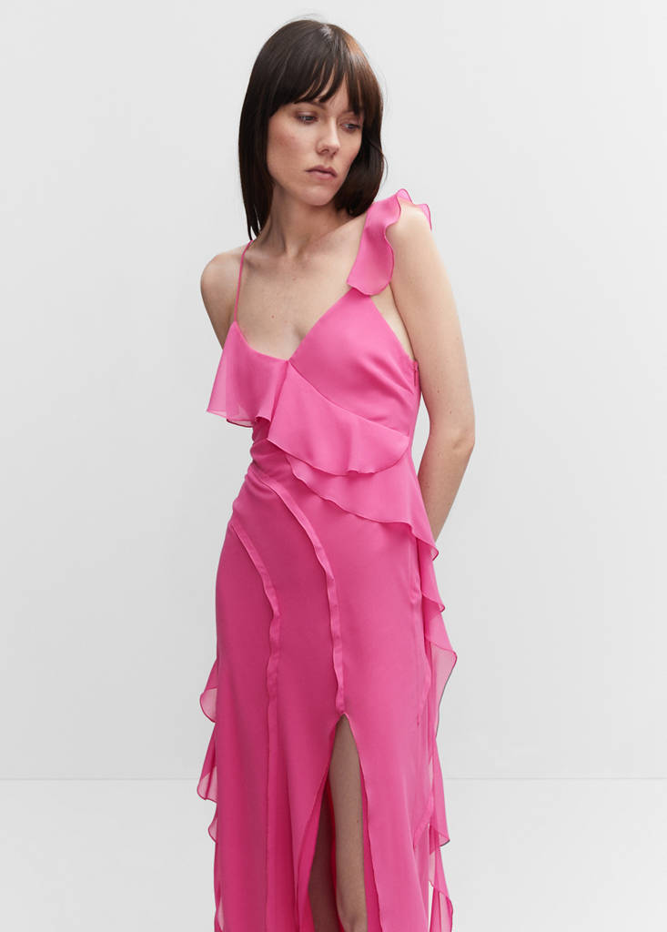 Tissu en gaze. Tissu fluide. Tissu semi-transparent. Asymétrique. Coupe droite. Coupe longue. Col en V. Bretelles fines. Dos nu. Fermeture Éclair latérale. Détails volantés. Fente latérale