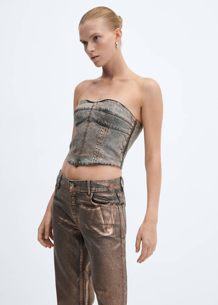 Tissu en coton style denim. Design crop. Style corset. Finition métallisée. Sans manches. Décolleté cœur. Coupe cintrée