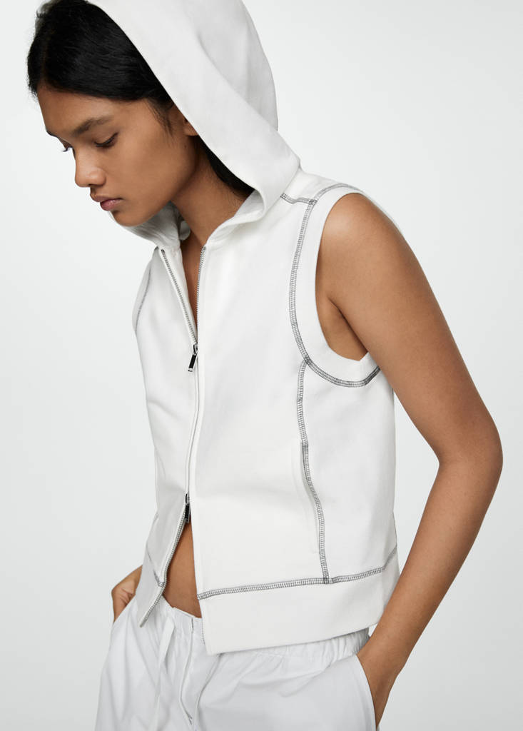 Tissu en mélange de coton. Coupe droite. Col rond. Avec capuche. Sans manches. Double fermeture Éclair. Coutures décoratives contrastantes