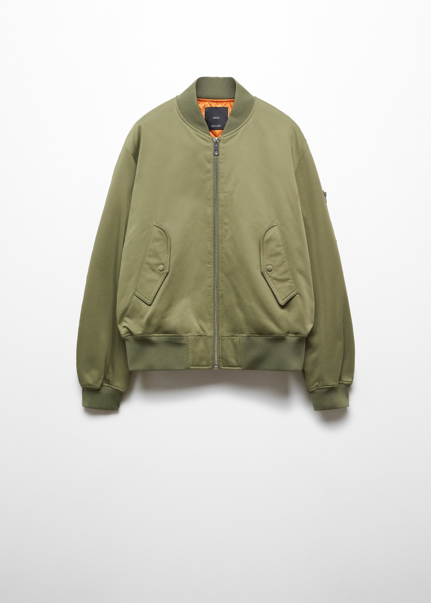 Tissu fluide. Design oversize. Col rond. Détail élastique dans le col. Manches longues avec poignets élastiques. Deux poches à rabat avec bouton sur le côté. Poche zippée sur la manche. Fermeture Éclair à l’avant. Bas élastiqué. Doublure.
