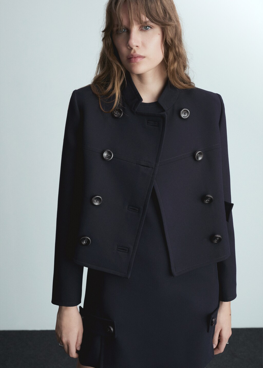 Coupe droite. Design crop. Col officier. Manches longues. Fermeture à double boutonnage. Total look. Doublure.