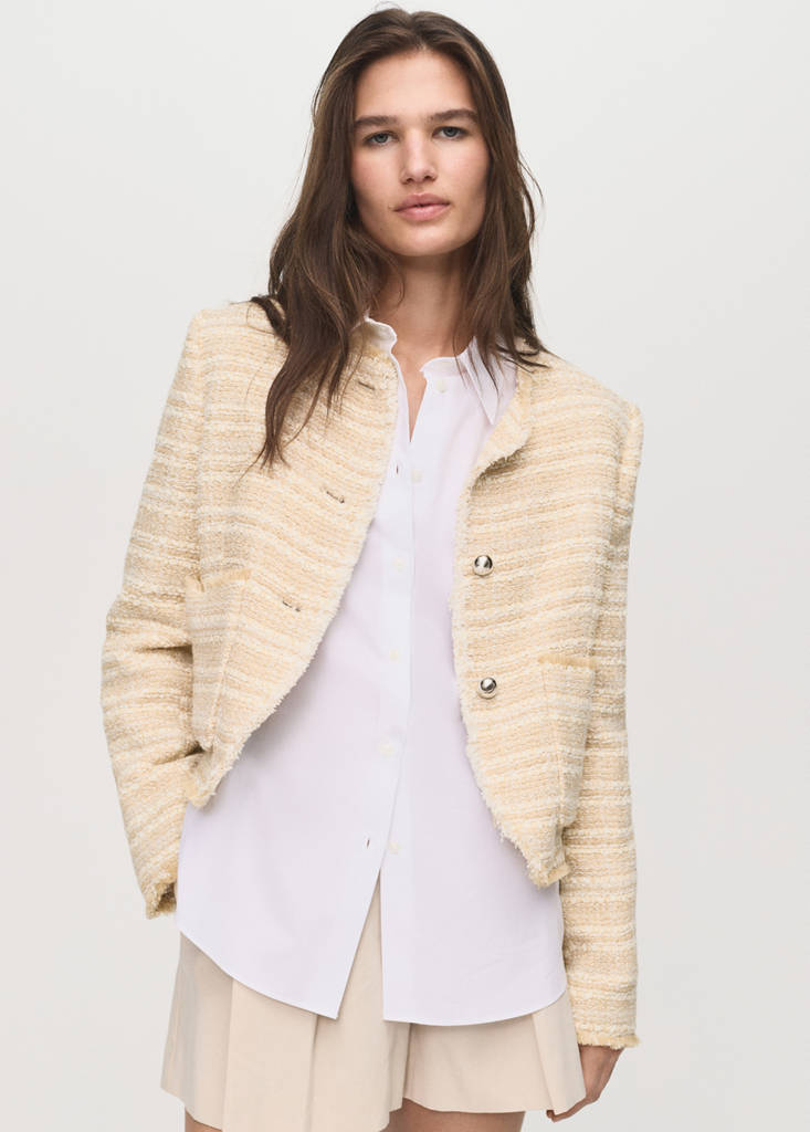 Tissu en tweed. Coupe droite. Col rond. Manche longue. Deux poches plaquées sur le devant. Bords effilochés. Boutons effet bijou. Fermeture avant avec boutons. Doublure intérieure. Disponible en grande taille