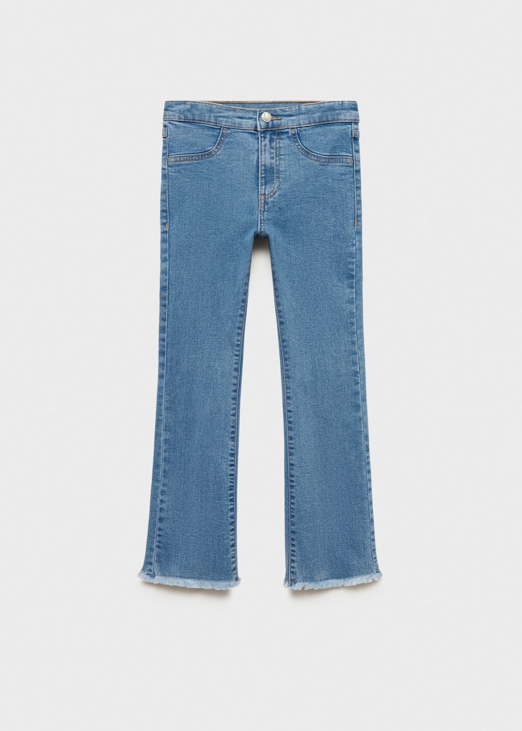 Tissu en coton style denim cowboy. Tissu en denim. Design Droit. Design long. Style flare. Taille mi-haute. Quatre poches. Bas effiloché. Passants de ceinture. Fermeture éclair et bouton.