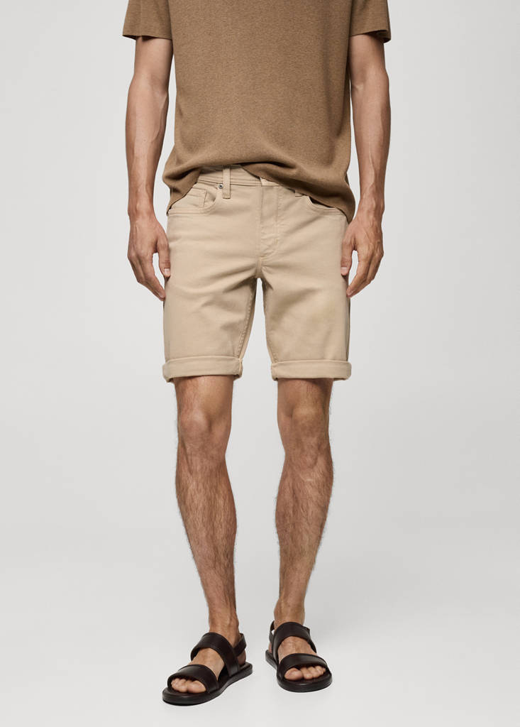Slim fit. Tissu en coton de style jean. Passants de ceinture. Fermeture zip et bouton. Deux poches sur les côtés. Poche gousset. Deux poches plaquées à l'arrière. Ourlet avec revers