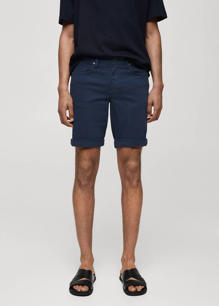 Slim fit. Tissu en coton de style jean. Passants de ceinture. Fermeture zip et bouton. Deux poches sur les côtés. Poche gousset. Deux poches plaquées à l'arrière. Ourlet avec revers