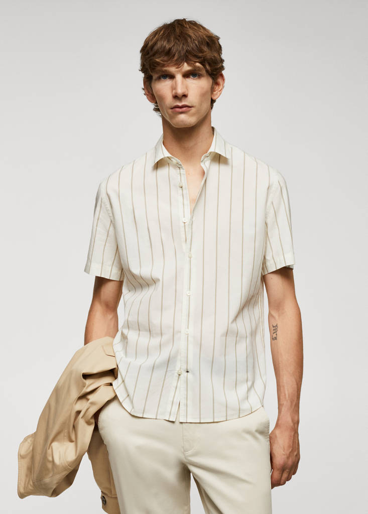 Coupe regular. Tissu en mélange de coton et lyocell. Tissu de Tencel mélangé, une fibre douce, légère, respirante et facile d'entretien. Motif à rayures. Col chemise. Manches courtes. Fermeture avant avec boutons. Ourlet arrondi