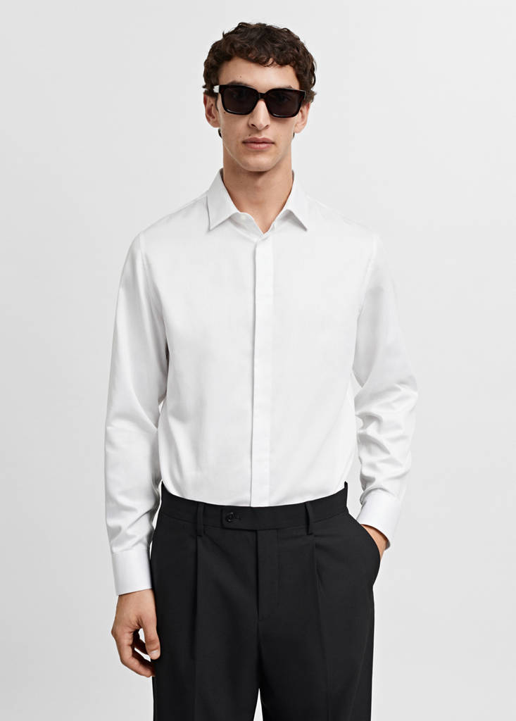 Slim fit. Col italien. Fermeture à boutons dissimulée sur le devant. Manches longues et poignets boutonnés. Tissu 100 % coton. Ourlet arrondi
