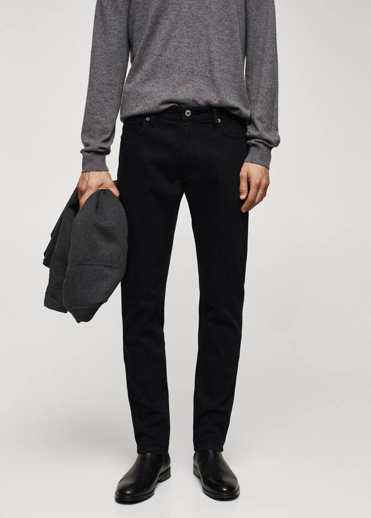 Slim fit. Tissu en coton. Couleur noire. Style jean. Passants de ceinture. Fermeture éclair et bouton. Deux poches latérales. Poche gousset. Deux poches plaquées à l'arrière. Collection Essentiels. Tissu coton durable mélangé. Passants de ceinture. Ce pantalon est disponible dans des tailles avec longueur supplémentaire de 5 cm, ce qui permet de conserver la coupe originale quelle que soit votre taille