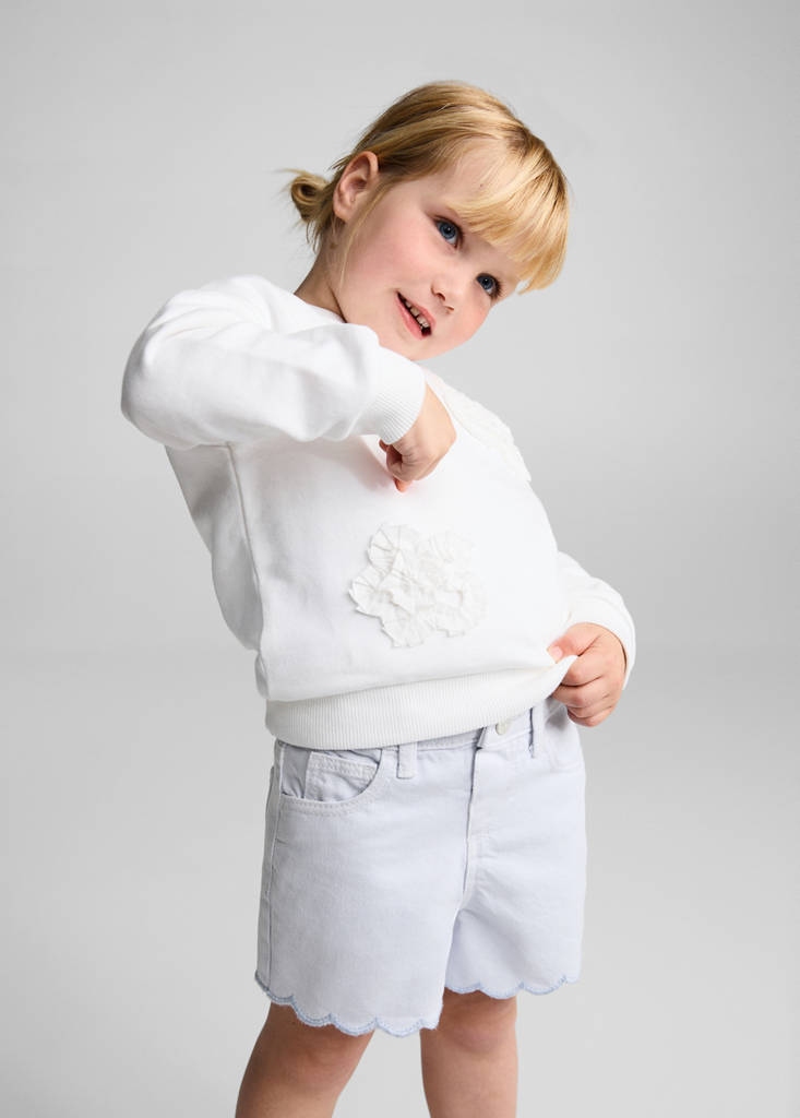 Denim-style cotton fabric. Straight design. Short design. Adjustable rubber band. Five pockets. One press stud fastening. Scalloped hem. Decorative embroidery on the hem