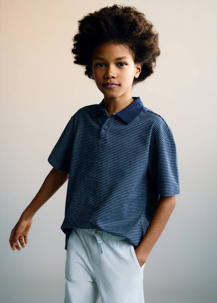 100% cotton fabric. Straight design. Striped design. Short design. Polo-neck with button closure. Short sleeves