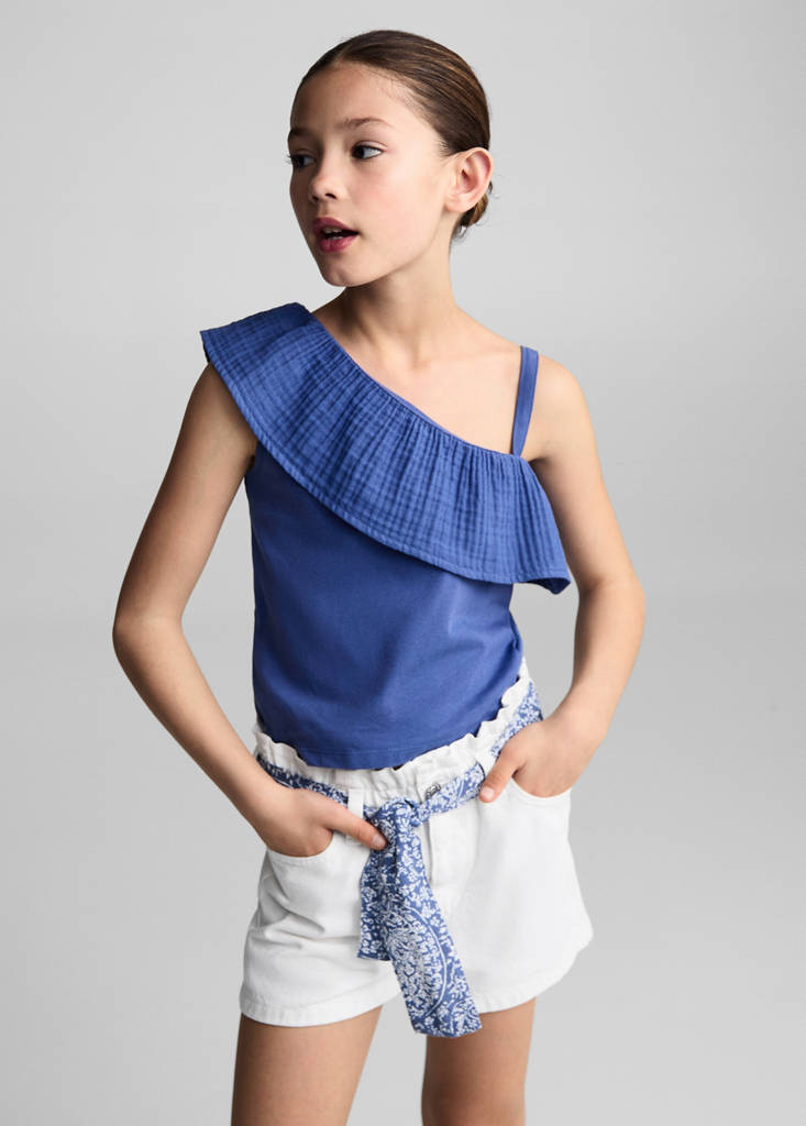 Ruffled asymmetric T-shirtPrice historyInitial price struck through [€ 15.99 ]€ 15.99Current price [€ 11.99 ]€ 11.99-25%Select a colourVibrant blueSelect your size5-6 years (116cm)Last few items!7-8 years (128cm)Not available. I want it!9-10 years (140cm)Not available. I want it!11-12 years (152cm)Not available. I want it!13-14 years (164cm)Not available. I want it!DimensionsAddAsymmetric design. Ruffled design. Lightweight fabric. Thin straps. Straight design. Asymmetrical neckline. Sleeveless. No FasteningDetails, composition and careStore availabilityItem qualitiesRecycled cottonAt least 20%This fibre is obtained from pre- and post-consumer textile waste that is transformed into new fabrics.