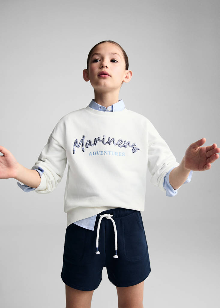 Cotton fabric. Short design. Elasticated waistband. Two pockets with flaps. Drawstring closure. Summer camp
