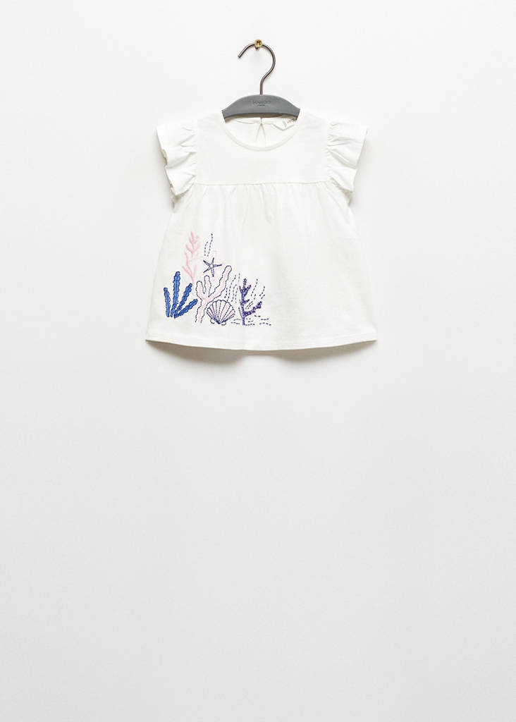 Decorative embroidery. Standard design. Round neck. Short sleeves. Short-sleeved ruffle. Button closure. Regular fit