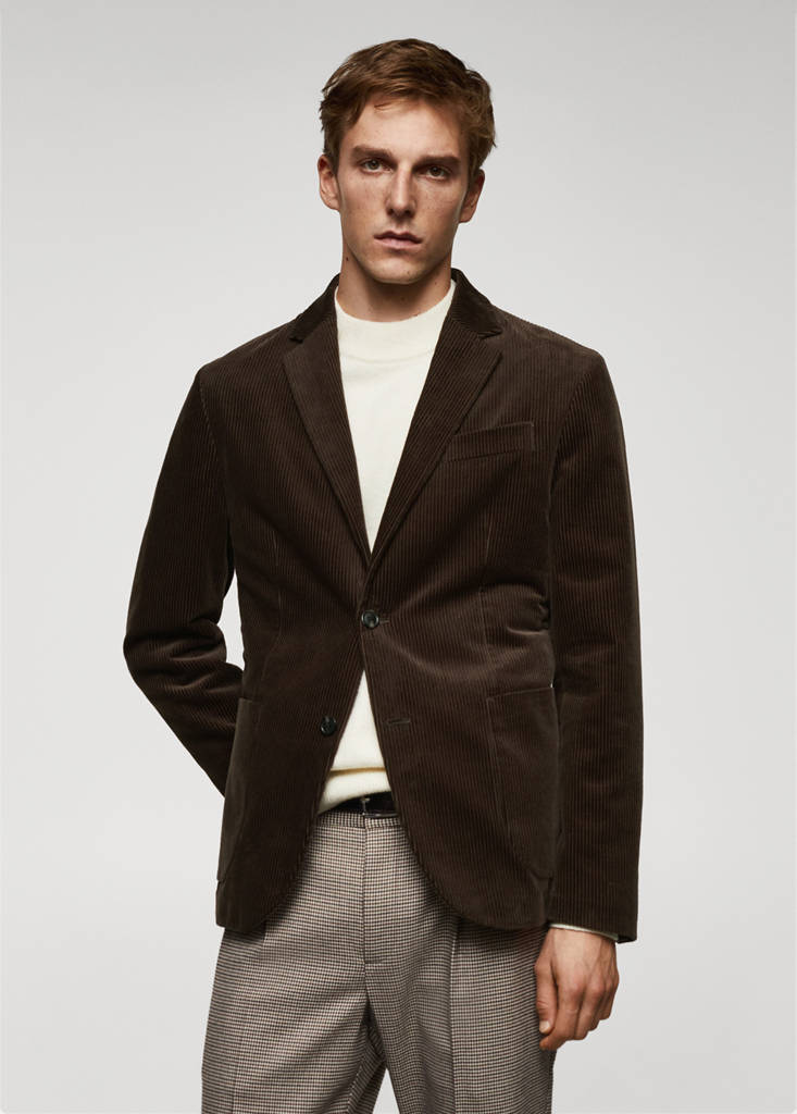 Slim fit. Corduroy fabric. Notched lapel collar. Chest welt pocket. Two patch pockets at the front. Long sleeves with buttoned cuffs. Without inner lining. Double back slit. 100% cotton fabric. Front closure with buttons