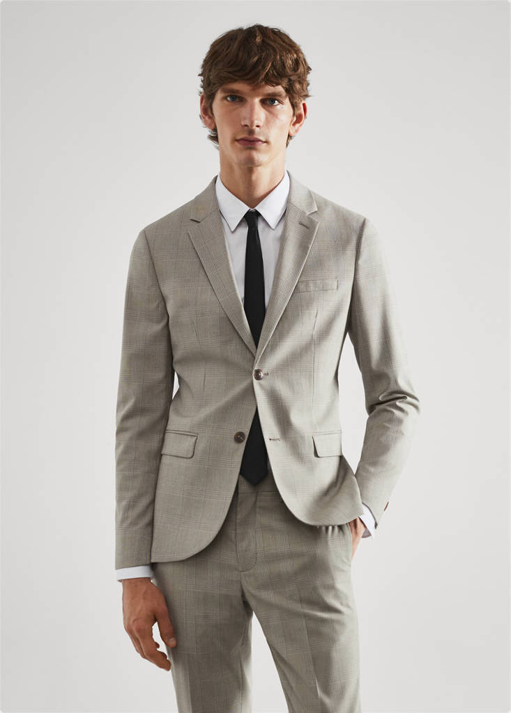 Super slim fit. Fabric made of recycled polyester, a durable, breathable, easy-care fibre that provides comfort in use. Comfort Stretch: Stretch fabric for added comfort. Prince of Wales check print. Lapel with notch. Button up. Chest welt pocket. Two pockets with flaps on the front. Double back slit. Inner lining. Inner pockets. Tailoring collection. Long buttoned sleeves. Comfort: Horizontal and vertical stretch fabric for added comfort