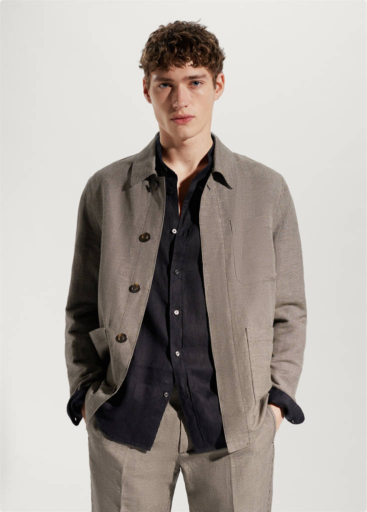 Regular fit. Linen mix. Light fabric. Medium design. Micro houndstooth print. Shirt-style collar. Concealed button closure on the front. Patch pocket on the chest. Two patch pockets on the front. Long sleeve. Straight hem. Without inner lining. The model is 187 cm tall and is wearing a size M