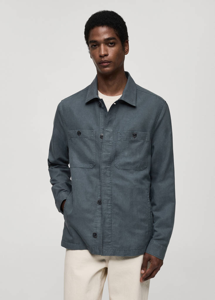Set available as total look. Slim fit. Linen and lyocell blend fabric. Shirt collar. Two buttoned patch pockets on the chest. Long sleeves with buttoned cuffs. Straight hem. Two front welt pockets. Front closure with buttons