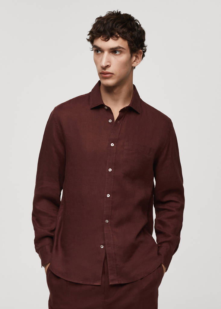 Khaki is an online exclusive. 100% linen fabric. Lightweight fabric. Button fastening at the front. Long sleeves with buttoned cuffs. Patch pocket on the chest. Classic fit. Classic collar. Rounded base