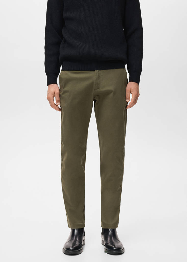 Chinos style. Tapered fit: wide cut at the top that narrows from the knee to the ankle. Cotton fabric. Belt loops. Waist with adjustable inner cord. Zip and button fastening. Soft elastic at front side waistband for added comfort and support the growing bump. Coin pocket at hip height. Two front pockets. Two pockets with buttoned flaps on the back. Standard Length. Slim Silhouette. Regular Waist