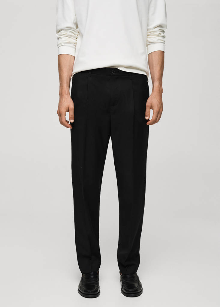 Regular fit. Mid-rise. Front fastening with double-breasted buttons and zip. Belt loops. Elastic band on the back. Two front pockets. Front pleat detail. Set available as total look. Pressed crease detail at the front and back