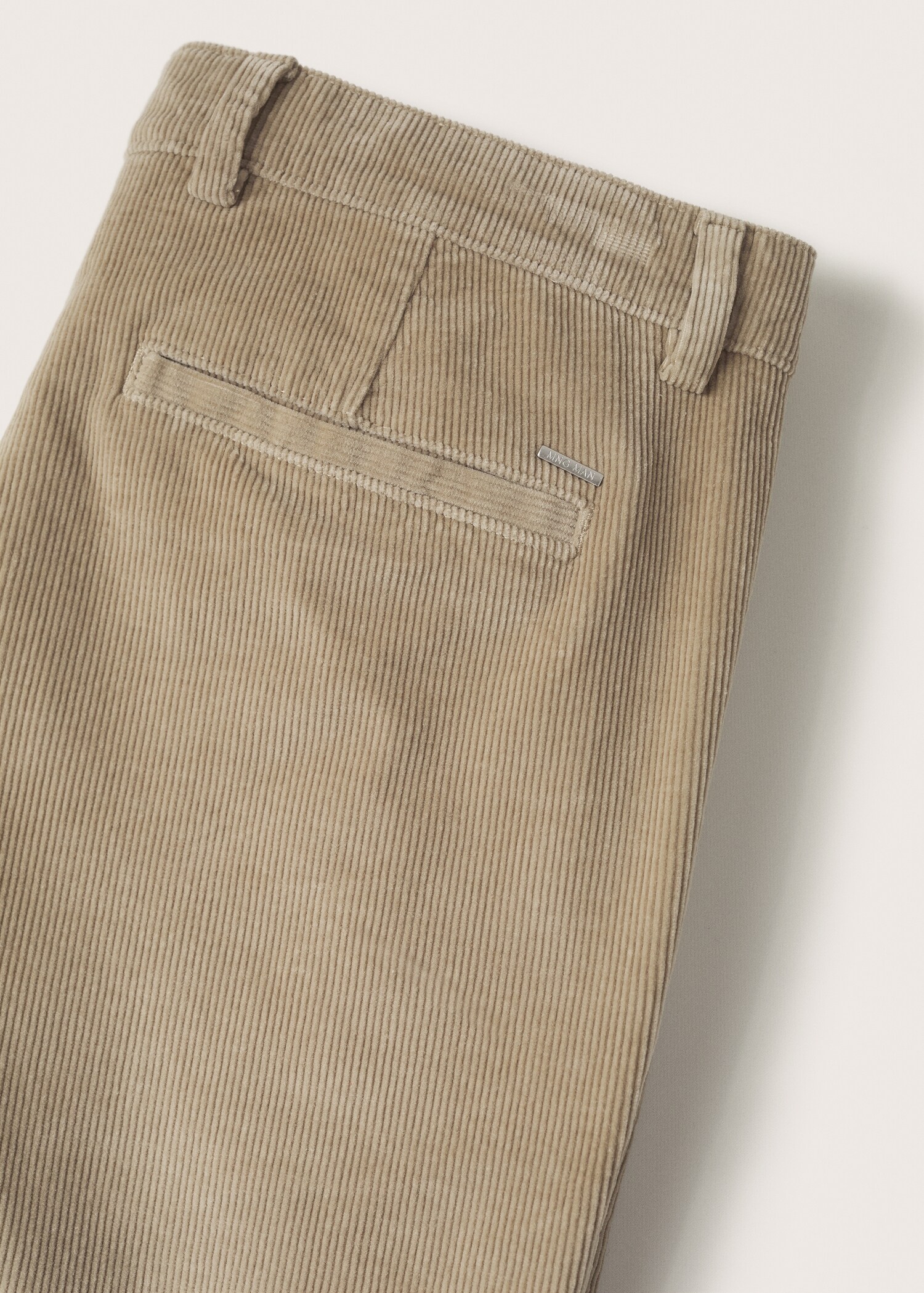 Tapered fit: wide cut at the top that narrows from the knee to the ankle. Cropped design. Cotton-blend fabric. Corduroy fabric. Loops. Zip and one button fastening. Two side pockets. Two patch pockets on the back. The model is 185 cm tall and is wearing a size 40.