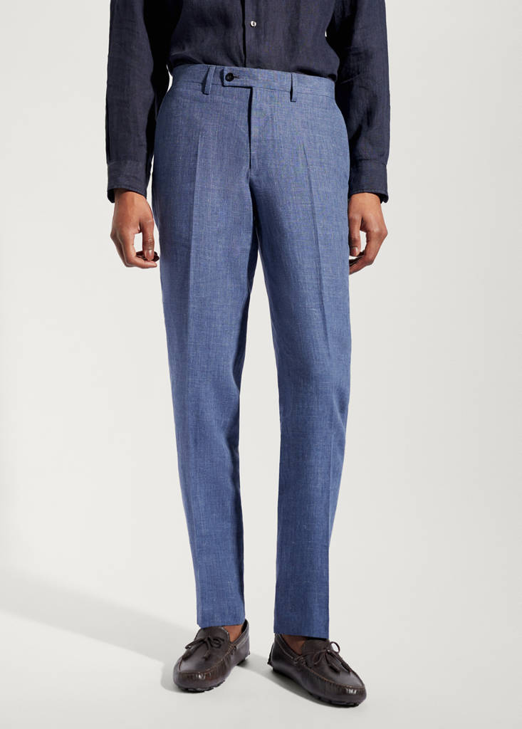 100% linen fabric. Lightweight fabric. Slim fit. Mid-rise. Concealed button, hook and zip fastening. Belt loops. Detail of front and rear calipers. Two side pockets. Two back pockets with buttons. Straight hem. Two welt pockets with button at the back. Tailoring collection. Darts on the front. Basics Collection