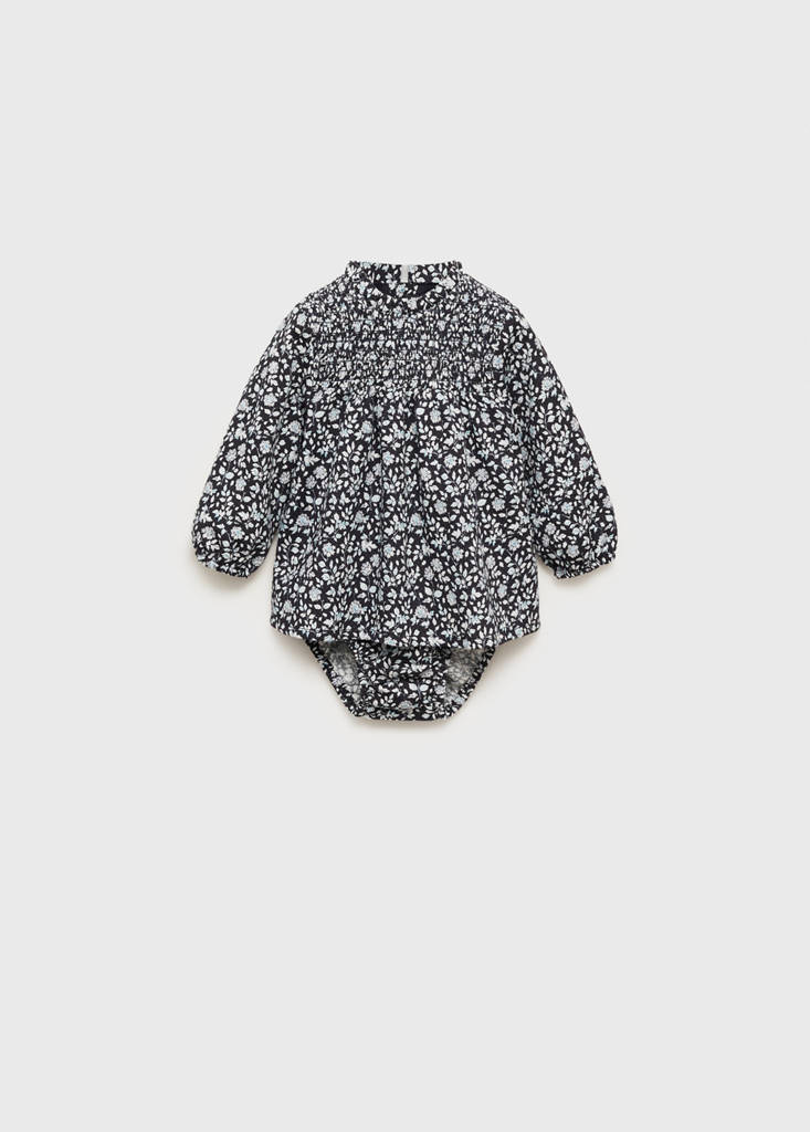 Straight design. Dress and short set. Gathered detail. Print Flowers. Round neck. Long sleeves. Back closure. Button closure