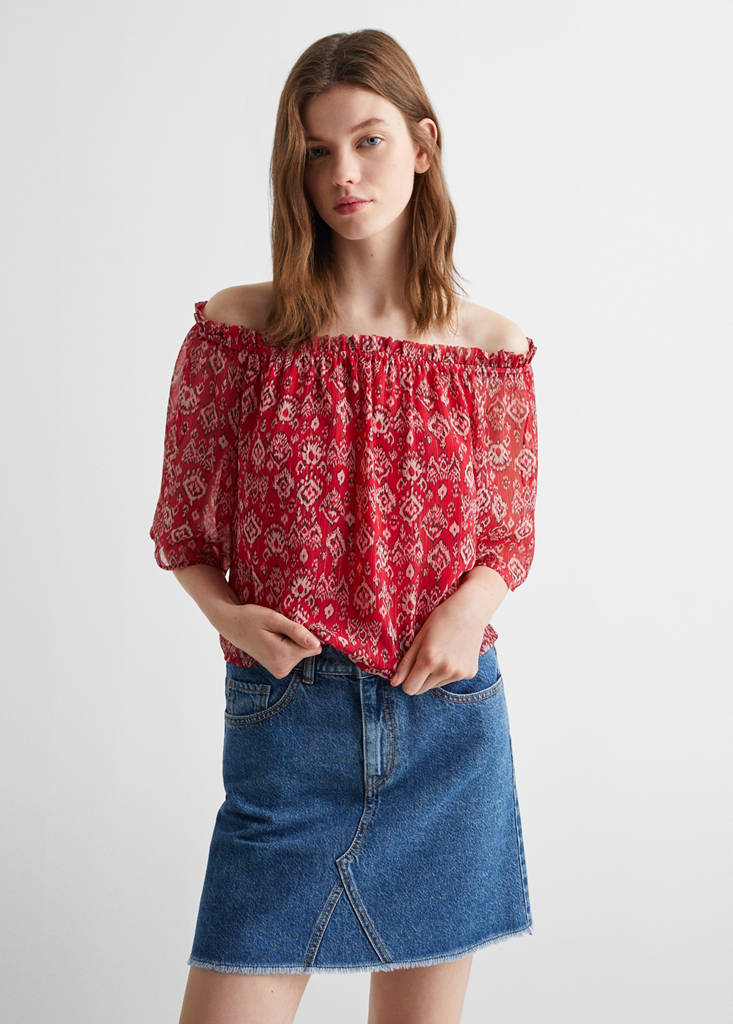 Print. Bands details. Off-shoulder design. Boat neckline. Short sleeves. No Fastening