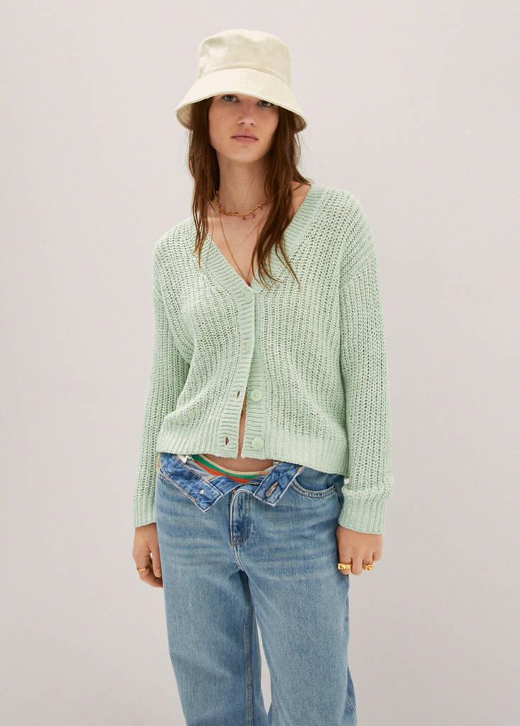 Thick knitted fabric. Straight design. V-neck. Long sleeve. Button fastening on the front section. Cable knit finish