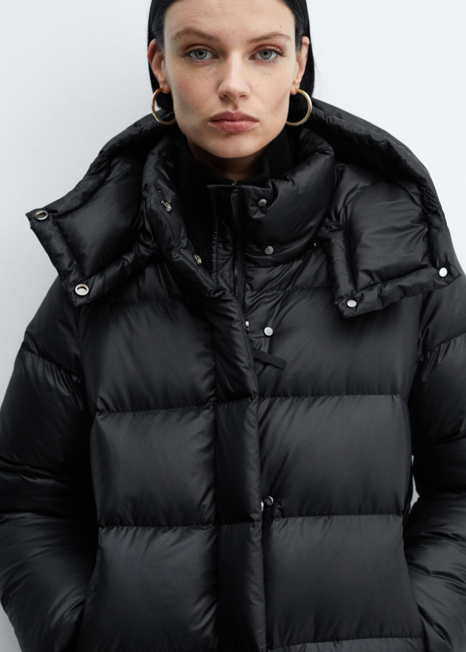 Premium down-filled anorak. Long design. Straight Design. Quilted design. Detachable hood. High neck. Long sleeve. Zip pockets on both sides. Front zip and snap button closure. Feather filling. Inner lining. Water-repellent: The durable finish of this garment protects against light rain, repelling contact with water and raindrops.