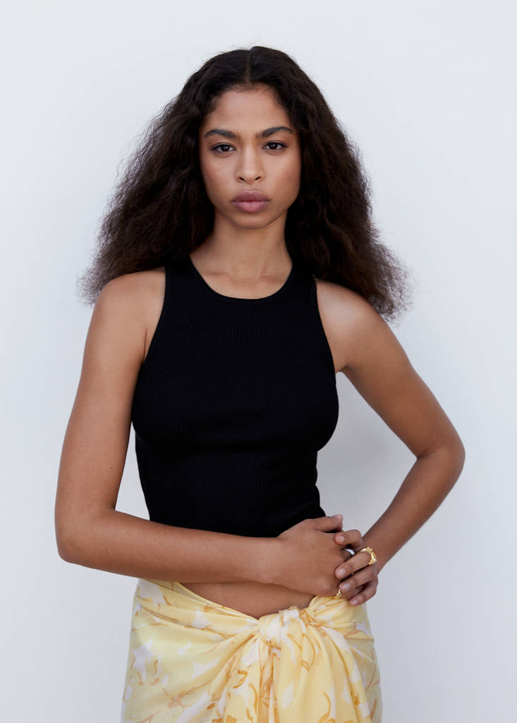 Fine knit fabric. Crop design. Round neck. Wide straps. Back opening. No Fastening. Available Plus. Fitted design
