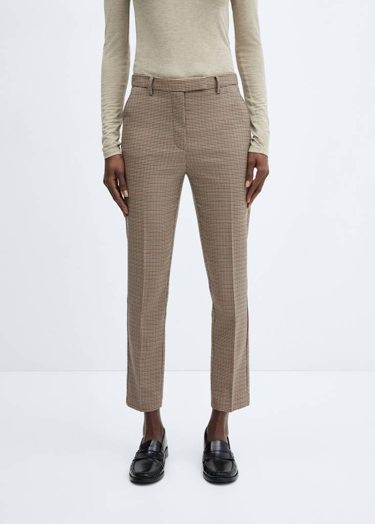 Cotton blend fabric. Suit style. Skinny fit. Crop design. Mid-rise. Belt loops. Two side pockets. Concealed button, hook and zip fastening. Available Plus. Office looks. Available in plain and patterned. Houndstooth print. College