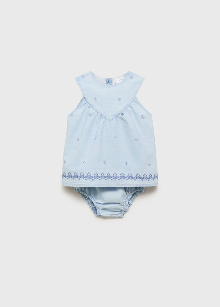 100% bavlna. Bavlněná tkanina ve stylu denim. Vyšívaná tkanina. Květinová výšivka. Kulatý výstřih. Bez rukávů. Detail nabírání vepředu. Zapínání vzadu. Zapínání na knoflíky. Ranita s elastickými zakončeními. Souprava