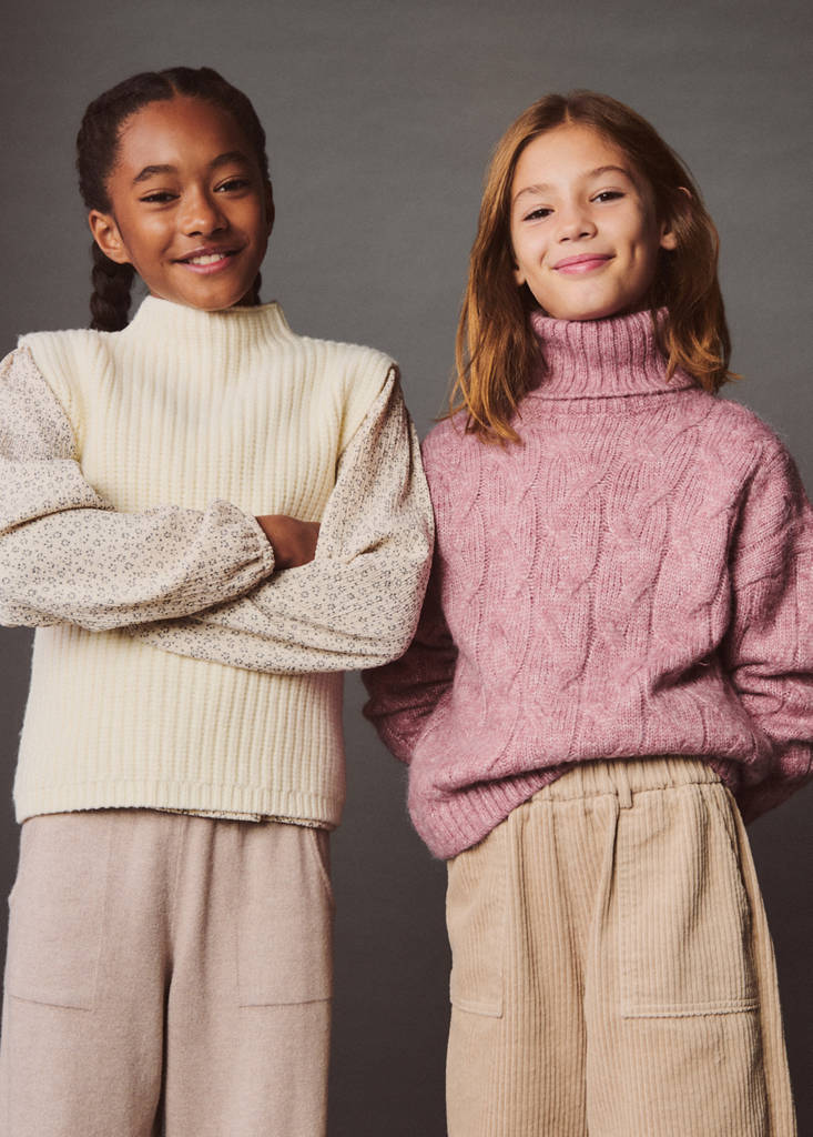 Hrubá pletenina. Rovný design. Perkins límec. Bez rukávů. Bez zapínání
