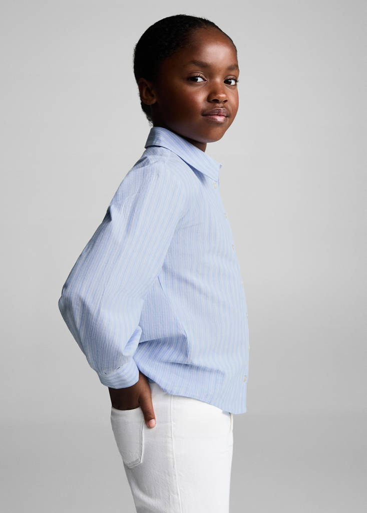 Kolekce Zpátky do školy. 100% bavlna. Rovný design. Košilový límec. Dlouhý rukáv s knoflíkovými manžetami. Přední zapínání na knoflíky. Design proužků