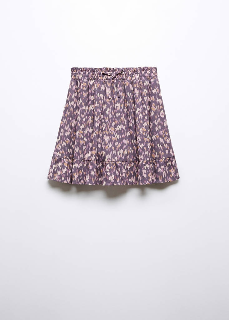Krátký design. Rovný střih. Volán ve spodním lemu. Pas s elastickou gumou. Šňůrkové zapínání. Design s potiskem. Viskózová látka