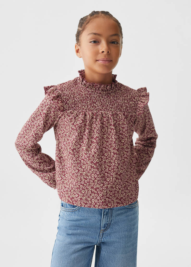 Potisk mikro květů. Rovný design. Detail volánků. Řasený detail na límci. Dlouhé rukávy. Kulatý výstřih. Zapínání na knoflíky