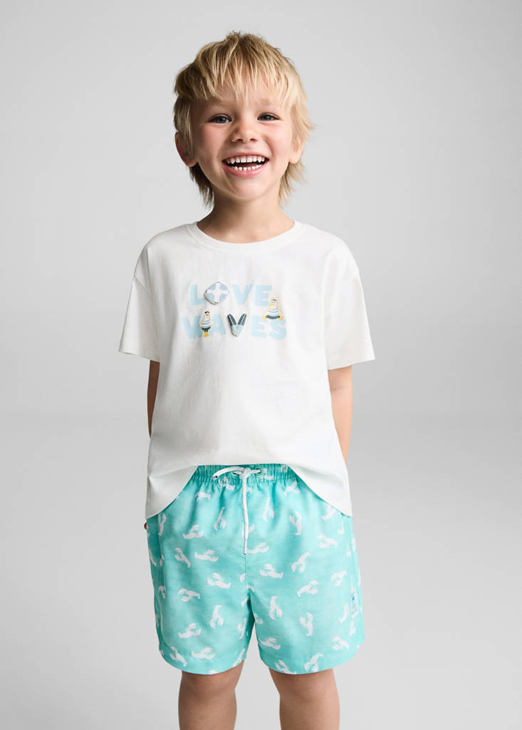 Koupelnová kolekce. Potisk motivu langusty. Pas s elastickou gumou. Šňůrkové zapínání. Nakládaná kapsa vzadu. Tento oděv je také k dispozici v kolekci Kids boy