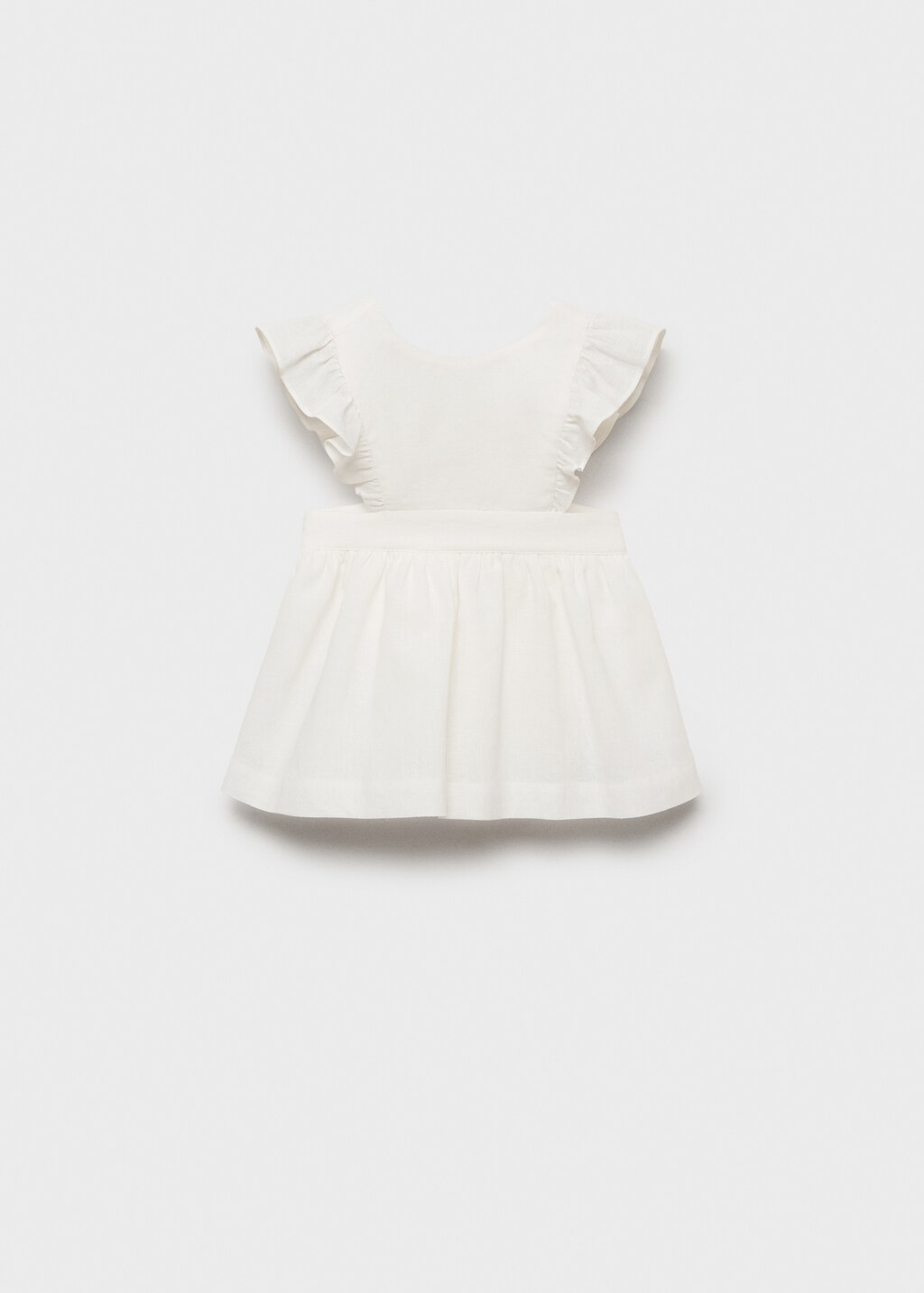Bavlněná látka. Lněná tkanina. Krátký rukáv s volánkem. Kulatý výstřih. Řasený panel. Detail volánu v pase. Zapínání na knoflíky v pase.