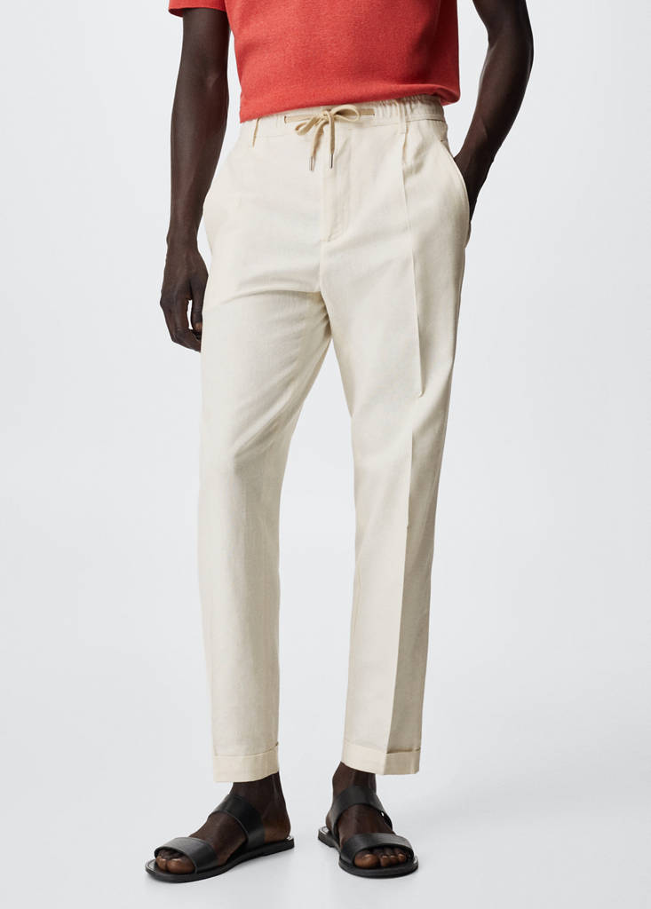 Relaxed fit. Střih jogger. Tkanina ze směsi bavlny a lnu. Pas se stahovací šňůrkou. Poutka. Dvě boční kapsy. Dvě lemované kapsy na knoflík vzadu. Ohrnutý spodní lem. Zapínání na zip a knoflík. Model/ka měří 187 cm a má na sobě velikost 42
