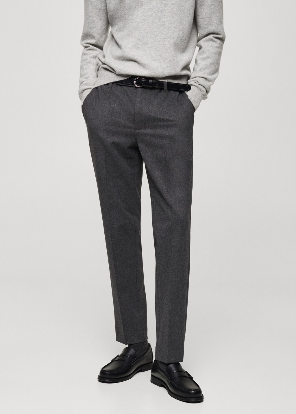 Detail zažehleného pruhu vpředu a vzadu. Dvouřadé zapínání na knoflíky. Poutka na pásek. Dvě boční lištové kapsy. Dvě zadní kapsy s lemem. Flanelová tkanina.