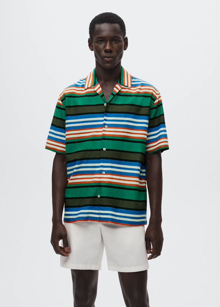 Pruhovaný vzor. Směsová látka z bavlny a viskózy. Splývavá tkanina. Límeček bowling. Krátký rukáv. Zapínání na knoflíky. Model/ka měří 187 cm a má na sobě velikost M