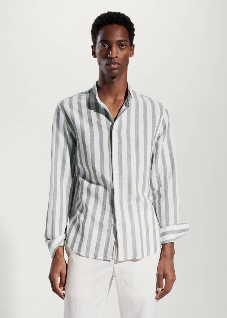 Tkanina ze směsi bavlny a lnu. Lehká tkanina. Regular fit. Mao límeček. Zapínání na knoflíky vepředu. Dlouhý rukáv s manžetami na knoflíčky