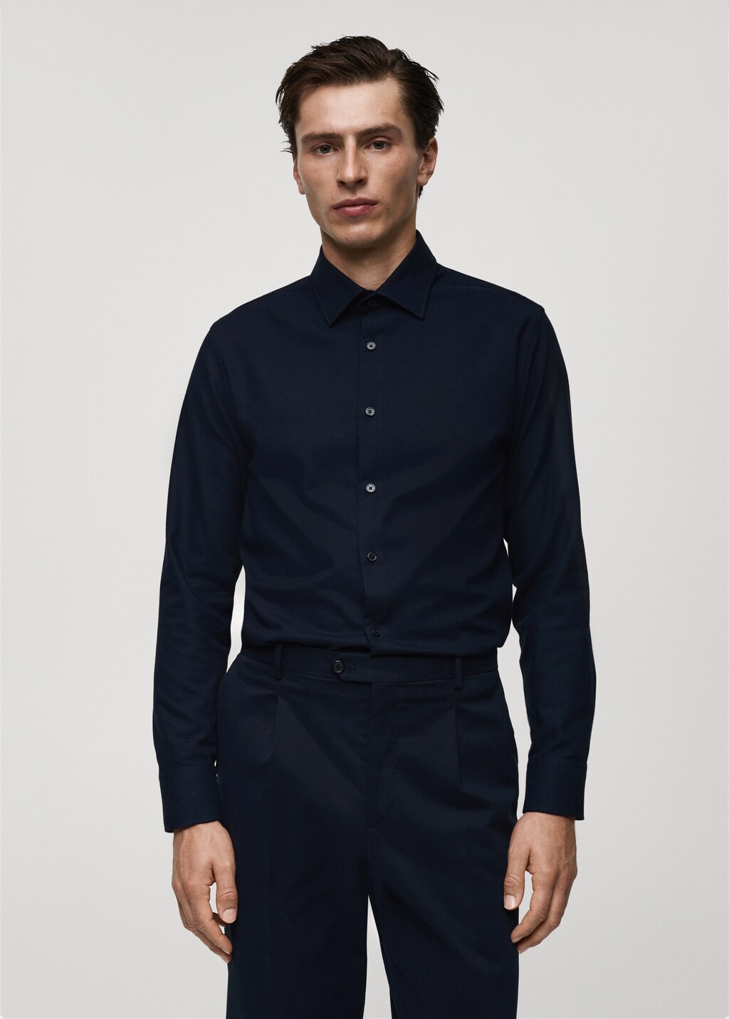 Tkanina ze směsi bavlny a kašmíru. Slim fit. Přední zapínání na knoflíky. Dlouhý rukáv s knoflíky. Kolekce Selection. Límec je vyroben z jednoho kusu, který skrývá švy spojující tělovou část oděvu. Zaoblený lem.