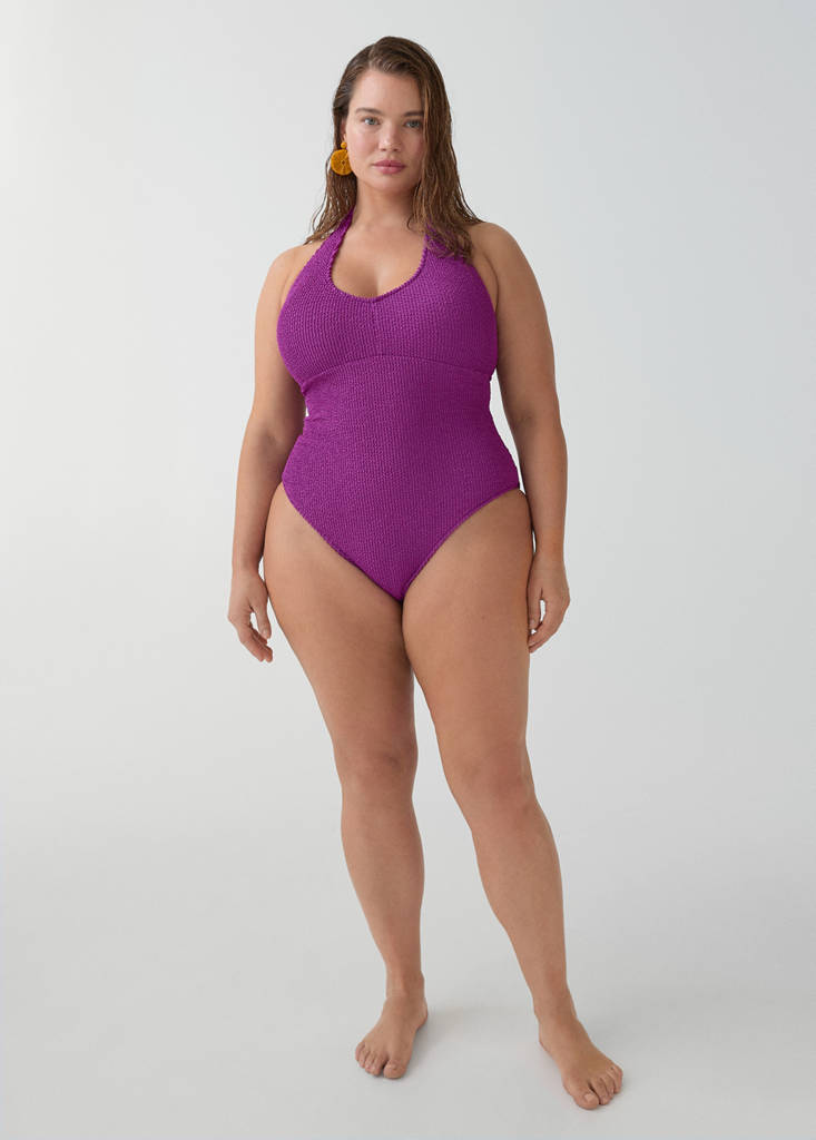 Tkanina s texturou. Halter límec. Kulatý výstřih. Nastavitelný zavazovací uzávěr. Podšívka. Kolekce k vodě. Exkluzivní Plus. Dostupné Plus