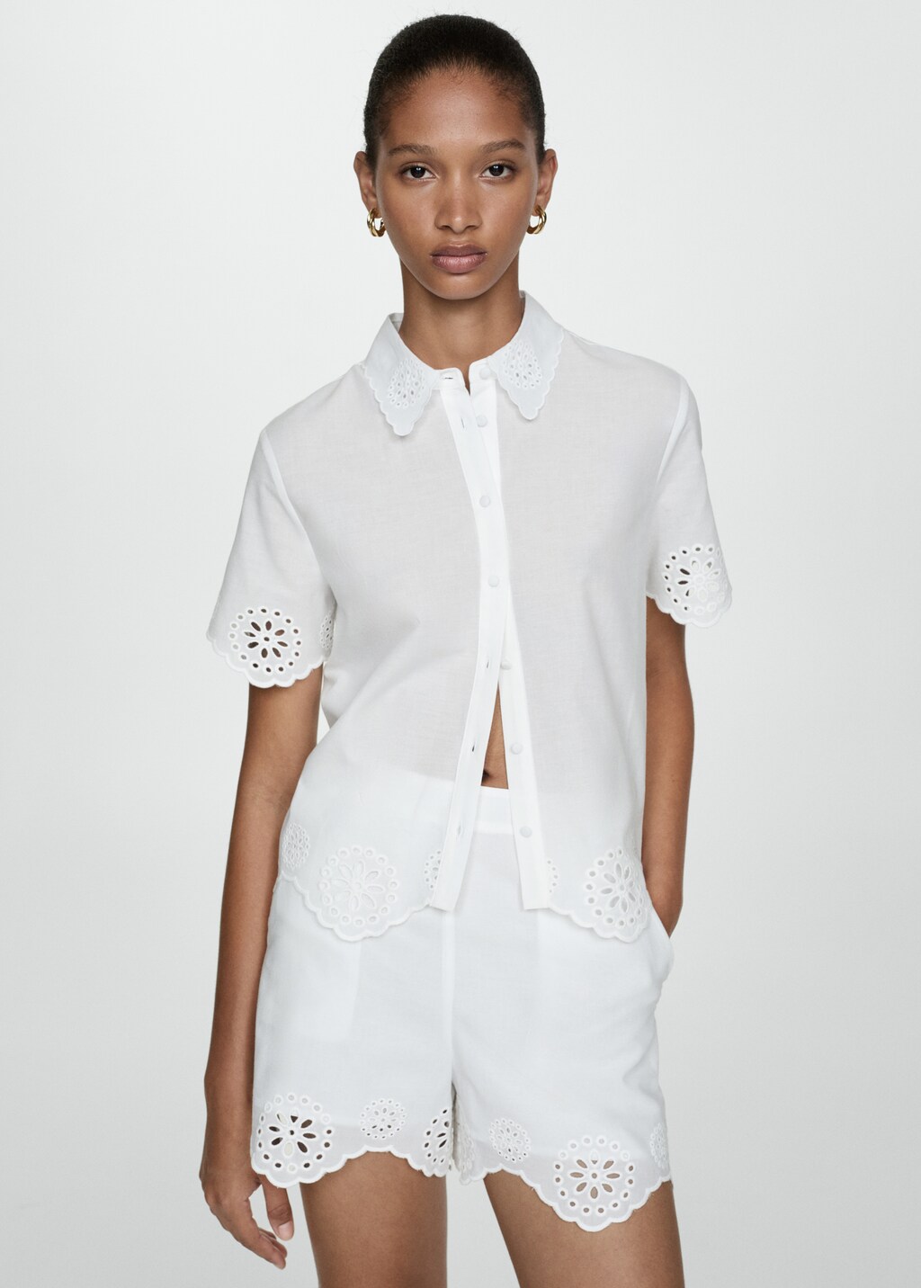 Rovný střih. Košilový límec. Krátký rukáv. Vyšívané detaily. Detaily otvorů. Zapínání na knoflíky vpředu. Vroubkovaná obruba spodního lemu. Total look. 100% bavlna.