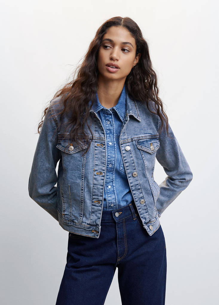 Bavlněná látka džínového stylu. Krátký střih. Dlouhý rukáv. Výstřih s límečkem. Dlouhý rukáv s manžetami na knoflíčky. Dvě nakládané kapsy s knoflíkem vepředu. Zapínání na knoflíky vepředu