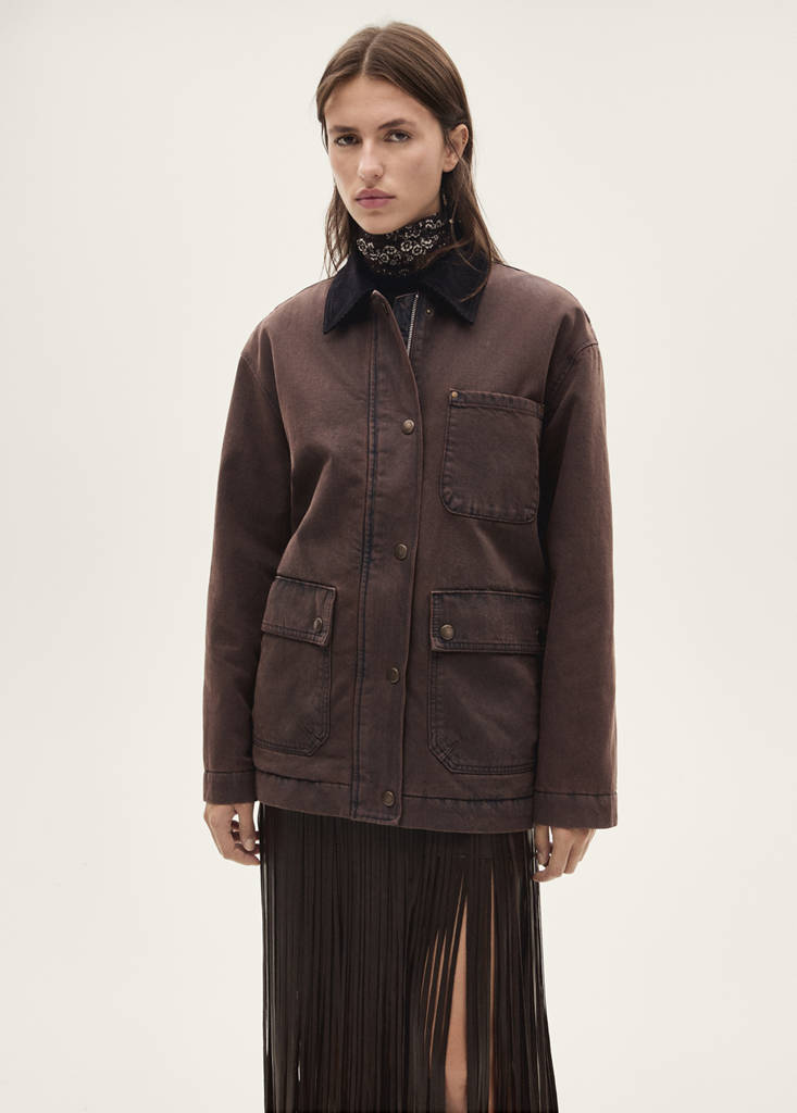 Džínový styl bavlněné tkaniny. Košilový límec. Dlouhé rukávy. Dvě kapsy s klopou na přední straně. Nakládaná kapsa vepředu. Podšívka. Zapínání na knoflíky vpředu. Rovný design. Kontrastní límec