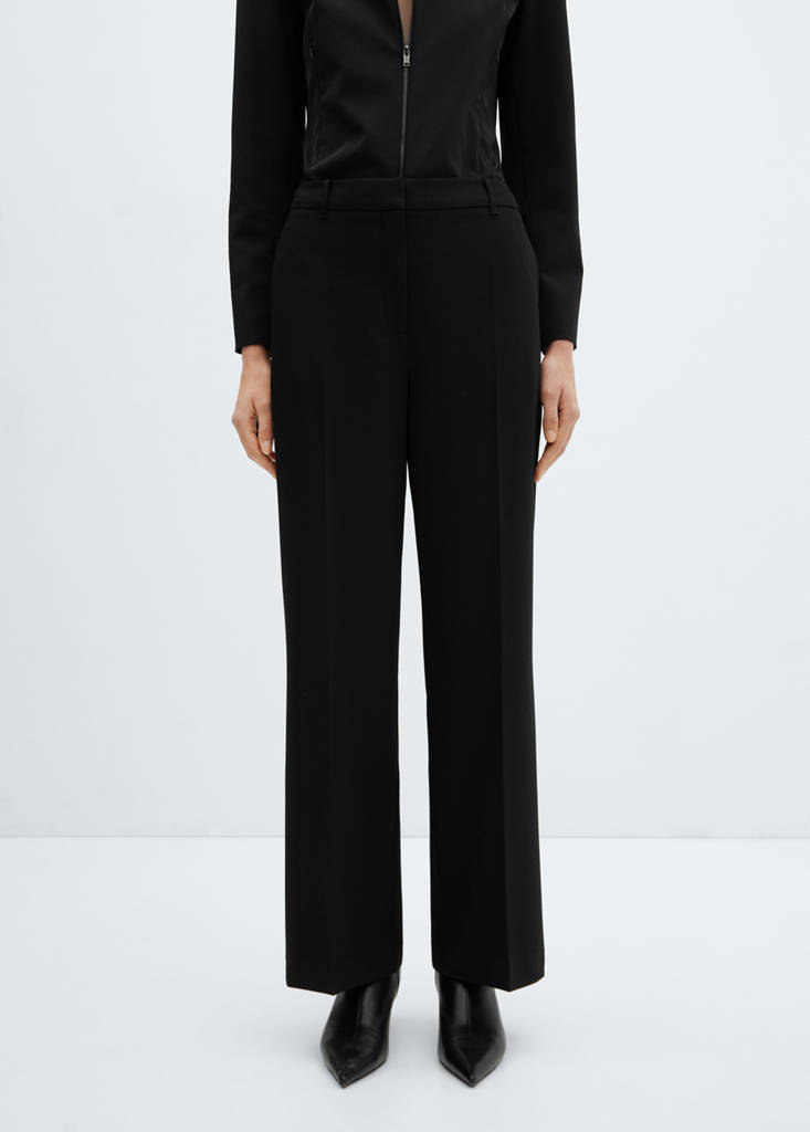 Široká lýtková část. Dlouhý design. Wideleg střih. Nízký sed. Poutka na opasek. Dvě boční kapsy. Skryté zapínání na knoflík, háček a zip. Podšívka. Looky do kanceláře. Střední velikost. Střední pas. Tekutá tkanina